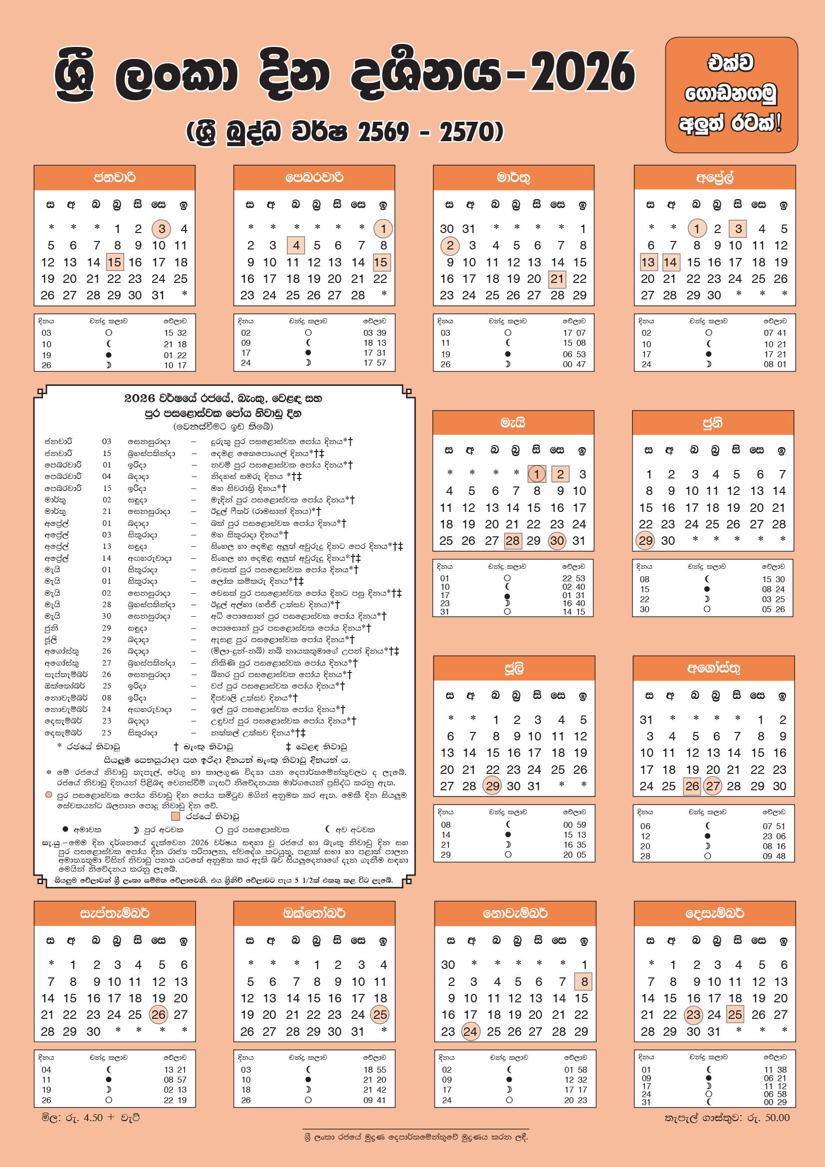 Jednym z głównych świąt buddyjskich ogłoszonych jako święta narodowe są dni Poya Pełni Księżyca w każdym miesiącu. W każdy dzień Poya Pełni Księżyca pracownicy mają prawo do płatnego urlopu, a banki i wszystkie organizacje pozostają zamknięte przez te 12 dni w roku. Oprócz tego, do innych ważnych świąt państwowych obchodzonych na Sri Lance należą: Święto Narodowe, Święto Pracy, Nowy Rok, Syngaleski i Tamilski Nowy Rok, urodziny Proroka Mahometa (Milad-un-Nabi), Tajski Dzień Pongal, Mahasivarathri, Eid al-Fitr, Eid al-Adha i Boże Narodzenie.