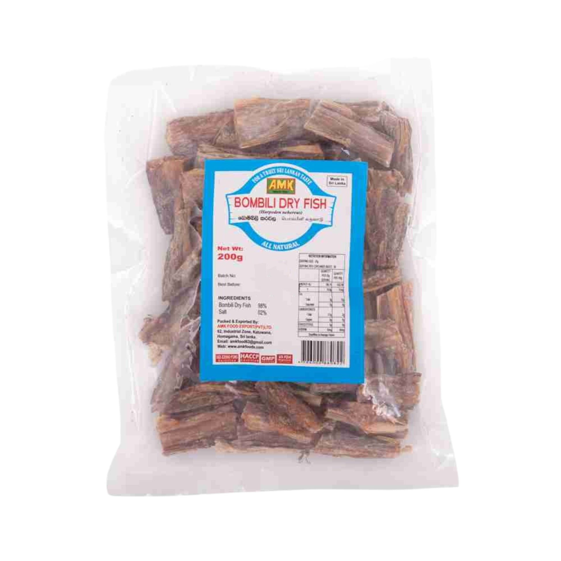 AMK Bombili Dry Fish (200g) offers a classic Sri Lankan delicacy made from sun-dried Bombay duck. Known for its distinctive flavor and aroma, this dry fish is perfect for preparing traditional dishes like dry fish curry or sambol. Hygienically processed and packed for long-lasting freshness, it delivers an authentic taste experience, making it a must-have pantry item for lovers of bold, coastal flavors.