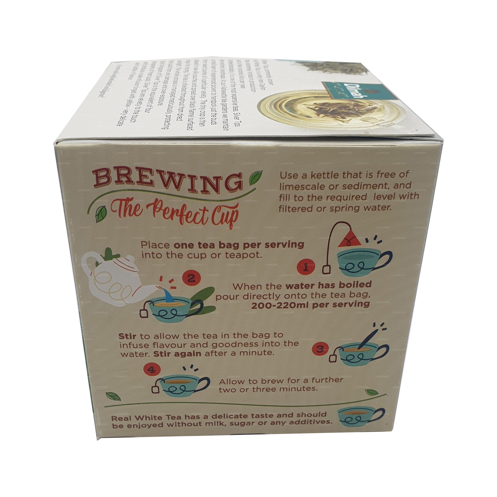 (SKU: LS9000109E) Ceylon Silver Tips, powszechnie znana jako Biała Herbata, to bardzo rzadka herbata cejlońska, w całości ręcznie robiona i bardzo ograniczona w produkcji - zaledwie kilkaset kilogramów rocznie. Zrozumiałe jest, że jest to jedna z najdroższych herbat. Silver Tips jest aksamitne w dotyku i wytwarza blady trunek zabarwiony żółtym - bardzo delikatny i subtelny w smaku. Rzadki, wyrafinowany odpust! W opakowaniu 10 jedwabnych sznurków i znaczników białych teabags. Podawaćz: Najlepiej wziąć prosto.