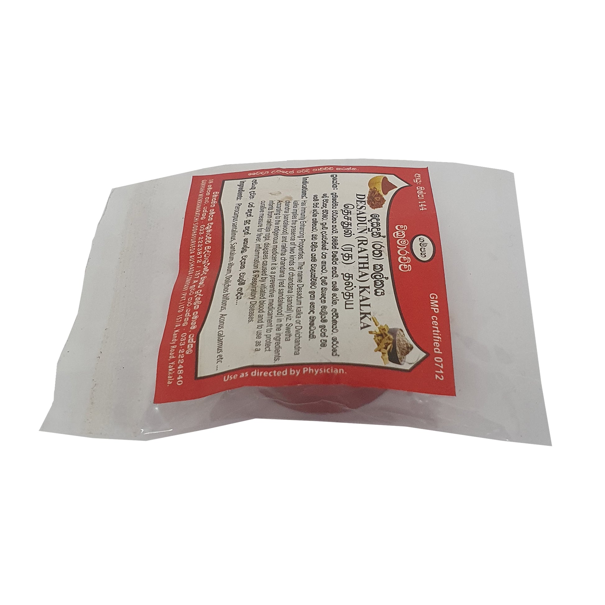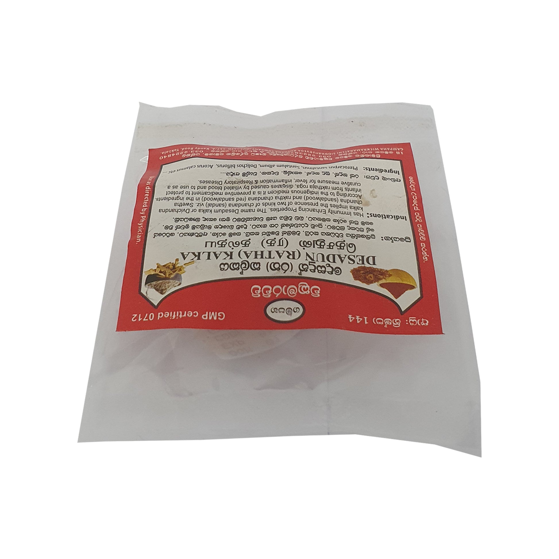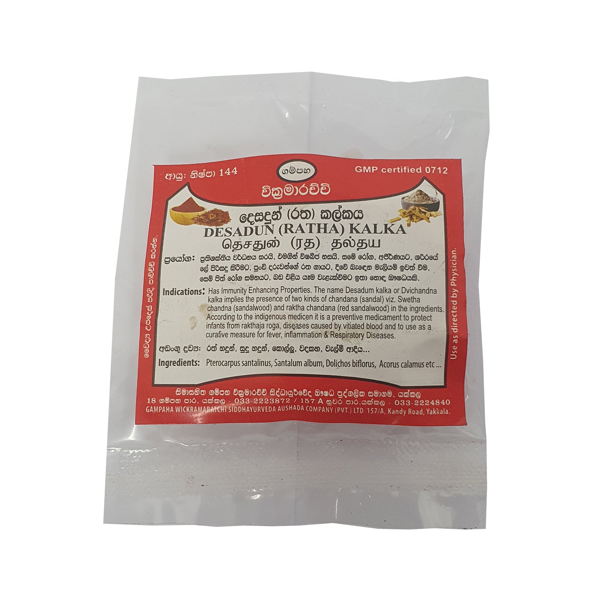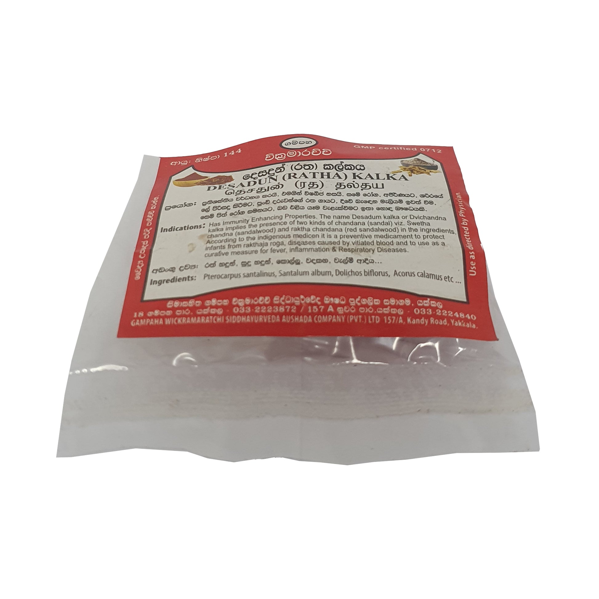 Gampaha Wickramarachchi Desadun Kalka (Ratha Kalka) to tradycyjna mieszanka lecznicza zawierająca białe i czerwone drzewo sandałowe, znane ze swoich właściwości wzmacniających odporność. Jest stosowana w medycynie ludowej głównie w celu zapobiegania chorobom krwi u niemowląt oraz w leczeniu problemów z wątrobą, stanów zapalnych i chorób układu oddechowego. Ten środek o podwójnym działaniu jest ceniony za swoje naturalne i skuteczne właściwości lecznicze w tradycyjnych praktykach zdrowotnych.