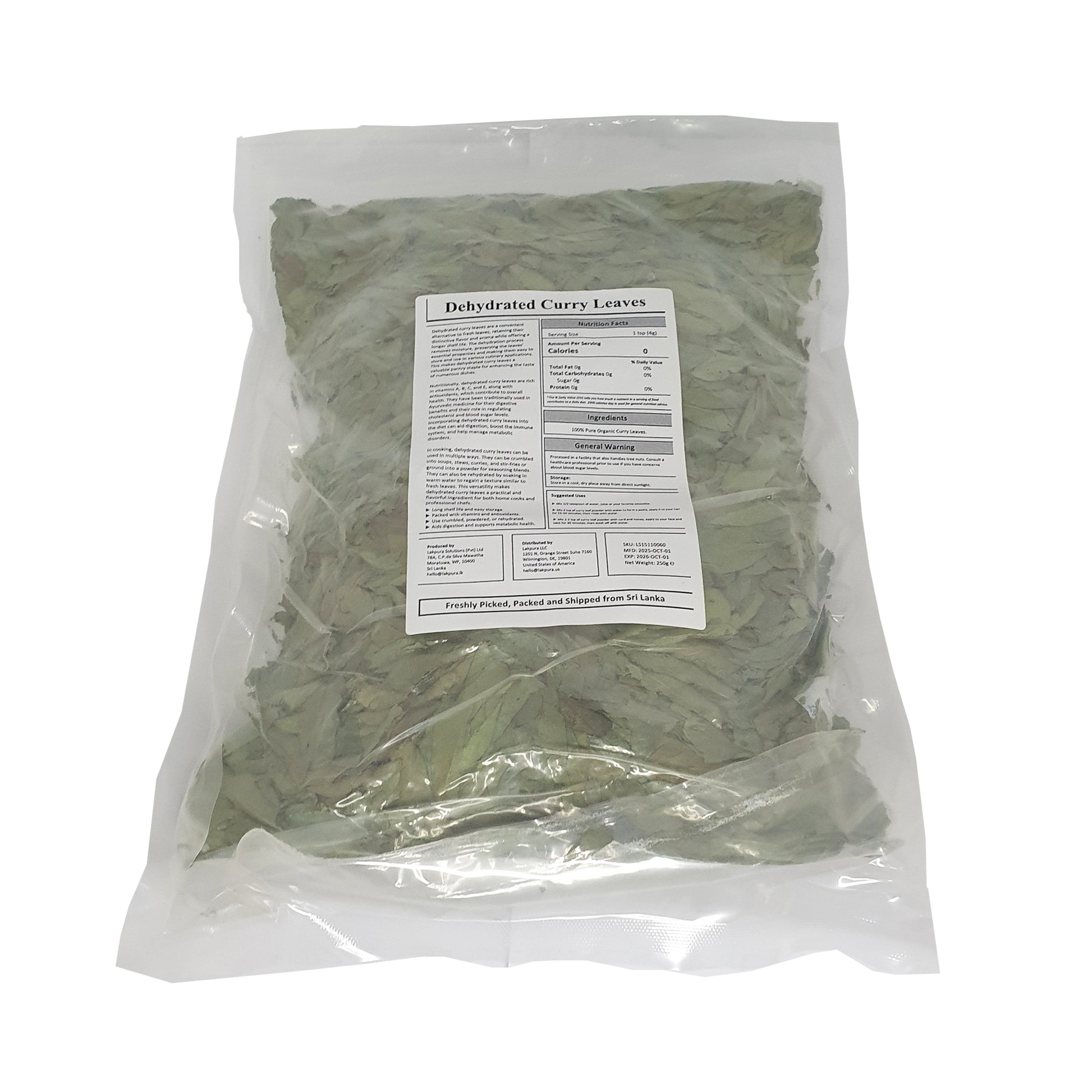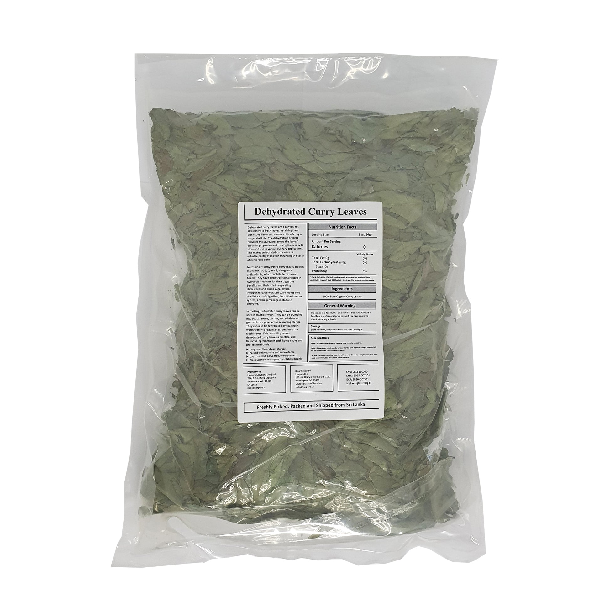 Lakpura® Curry Leaves są zbierane głównie z ogrodów przydomowych i małych farm, a następnie sortowane i suszone w ściśle higienicznych warunkach, co zapewnia, że składniki odżywcze i aromatyczne właściwości liści nie zostaną utracone. Liście curry są suszone, aby zapewnić dłuższą trwałość bez uszkadzania ich wartości odżywczych. Nadają one bardzo unikalny ziemisty, cytrusowy zapach, gdy są używane w curry, chutneyach, smażonych potrawach, a nawet zupach.