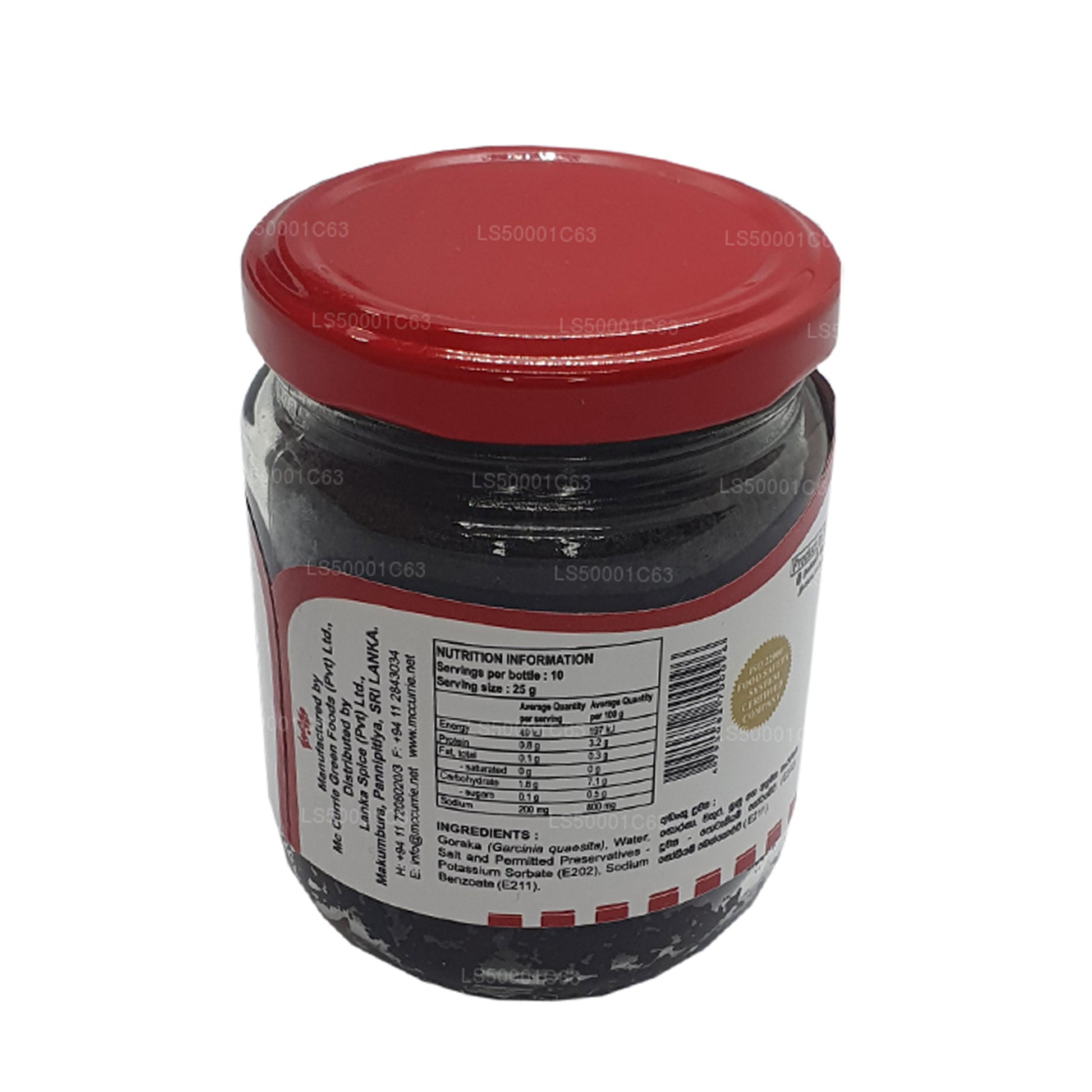 (SKU: LS50001C63) "Mc Currie" Pasta Goraka jest przygotowywana przy użyciu świeżej goraki, soli, wody i dozwolonych konserwantów. Jest to lepsze niż używanie zwykłej goraki, ponieważ ta pasta wzmacnia smak twoich curry, zwłaszcza Fish Ambulthiyal i Kirihodi (tradycyjne danie z zupy kokosowej na Sri Lance). Odrobina pasty goraka „Mc Currie” w curry z ryb może zamienić ją w przepyszne danie, które najlepiej będzie komponować się z prostym białym ryżem, warzywo ziemniaczane i gotukola sambol.