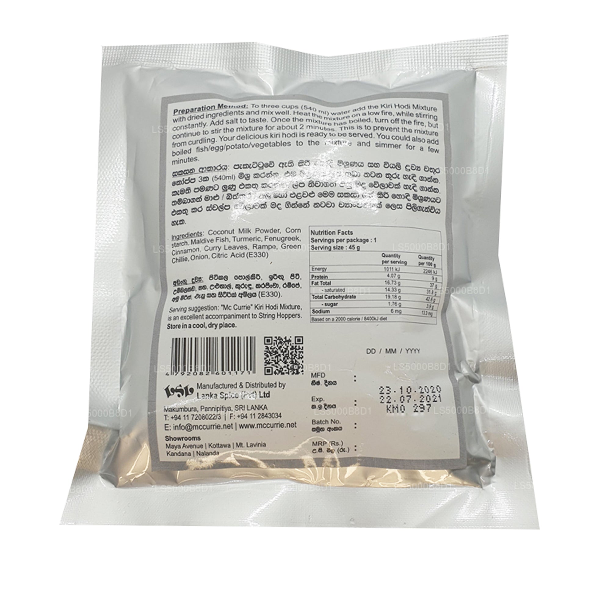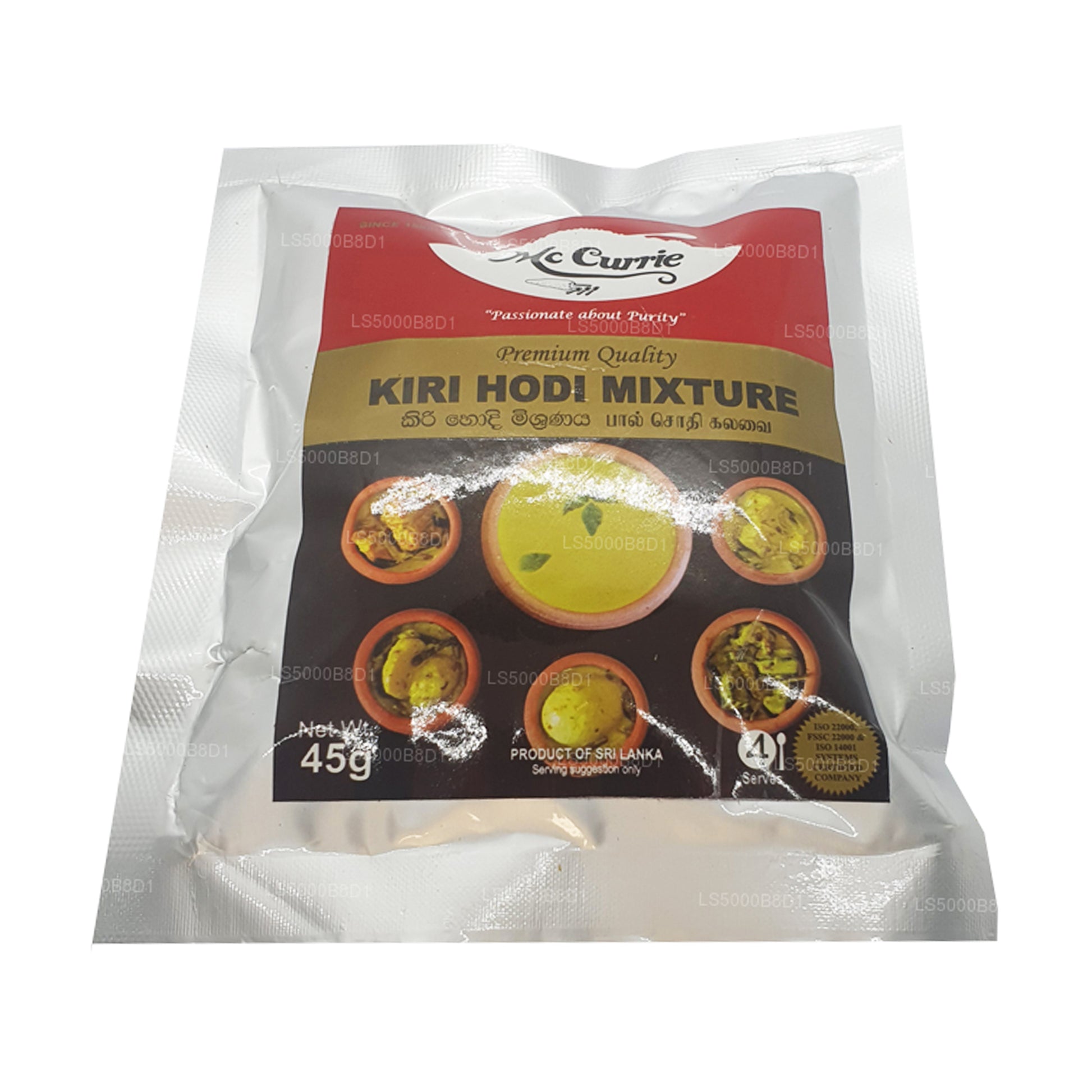 (SKU: LS5000B8D1) Kiri Hodi to popularny i tradycyjny sos z mleka kokosowego ze Sri Lanki. Wykonane z kilku podstawowych składników, to danie jest tradycyjnie podawane na gorąco wraz z kokosowym sambolem (pol sambola) lub leje strunowe (idiyappam). Warzywa i ryby można dodać do sosu, aby uzyskać bardziej obszerne danie curry.