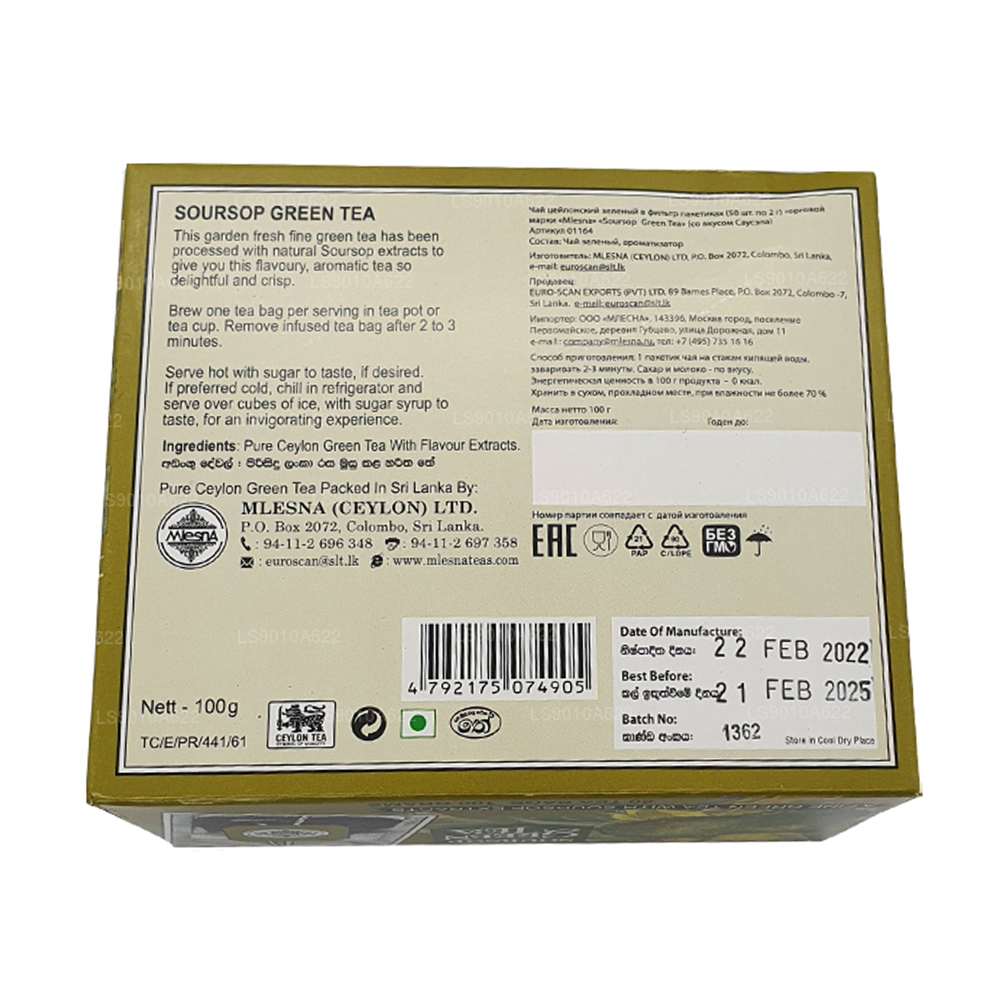 .Ta herbata pochodzi z Mlesny na Sri Lance. Każde pudełko zawiera 50 torebek herbaty/100 gramów herbaty. Jest to jedyna zielona herbata Soursop na świecie, która wykorzystuje prawdziwy ekstrakt z Soursop zamiast imitacji, dzięki czemu jest tak cudownie dobra! Soursop (Graviola)
