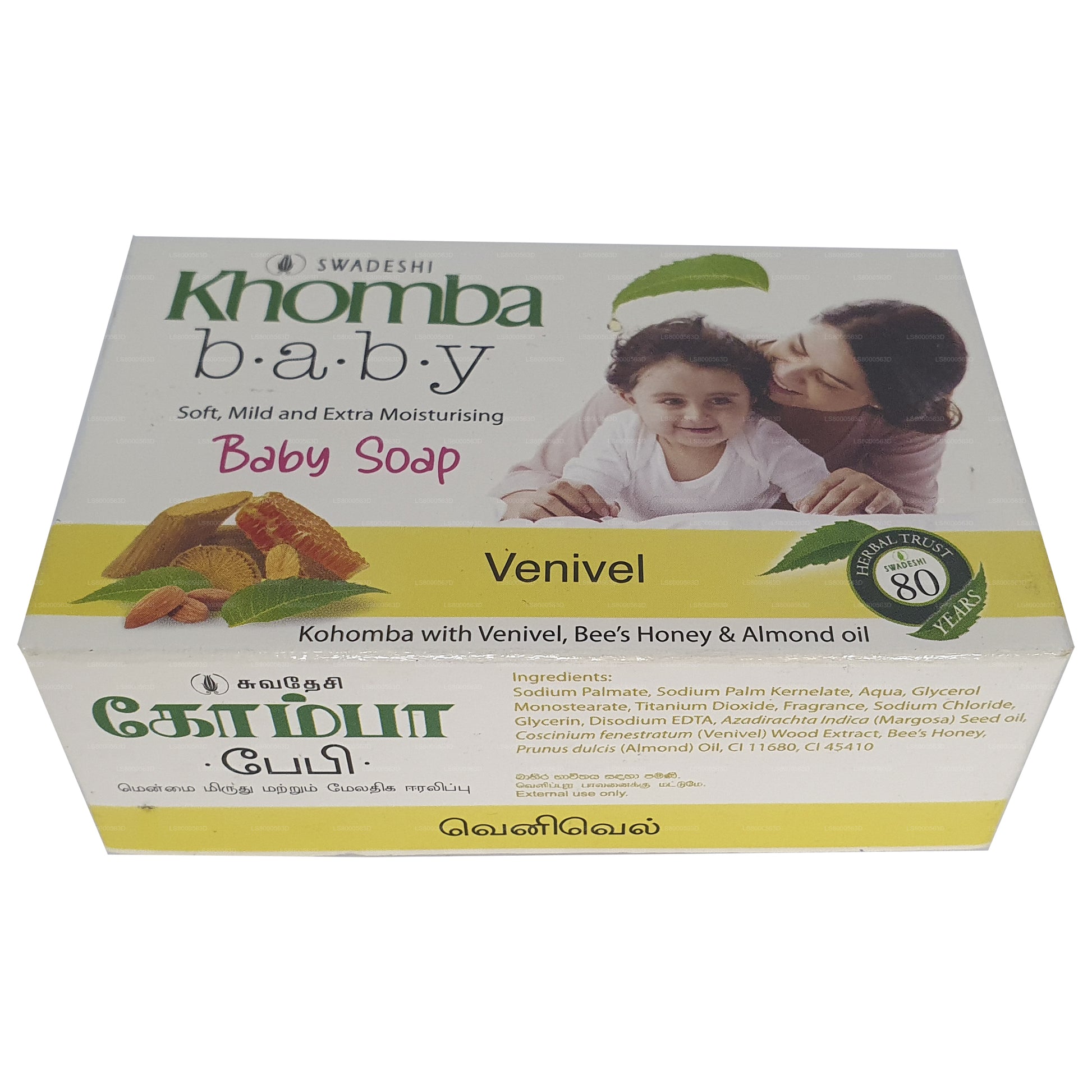 Enriched with Natural Margosa and Venivel, Khomba Baby Venivel soap provides, Natural moisturizer, Antibacterial assurance and Vitamin E nourishment for clear and soft skin to comfort your baby.