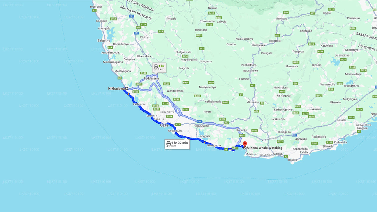 Zostaniesz odebrany z hotelu w Hikkaduwa o 5:00 rano i przewieziony do Mirissy klimatyzowanym pojazdem. Podróż z Hikkaduwa do portu w Mirissa trwa około 1 godziny 20 minut. Łódź wypływa z portu o 6:30 rano. Wycieczka na obserwację wielorybów trwa około czterech godzin, w tym czas podróży tam i z powrotem do portu. Spędzisz około jednej godziny w głównym punkcie obserwacyjnym, gdzie wieloryby są wyraźnie widoczne. Całkowity czas trwania wycieczki to około siedem godzin.